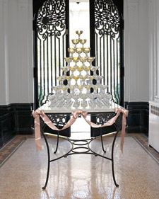 Forget the traditional bridal bouquet. A cute clutch from Nordstrom.com will suit this fashion-forward scene much better. The maid of honor can carry a clutch too, but make sure it's slightly different to let you shine. The men can skip the boutonnieres and get silk handkerchiefs from Men's Wearhouse to tuck into their breast pockets. And instead of corsages, buy sparkly brooches for your moms from etsy. They can double as thank-you gifts.